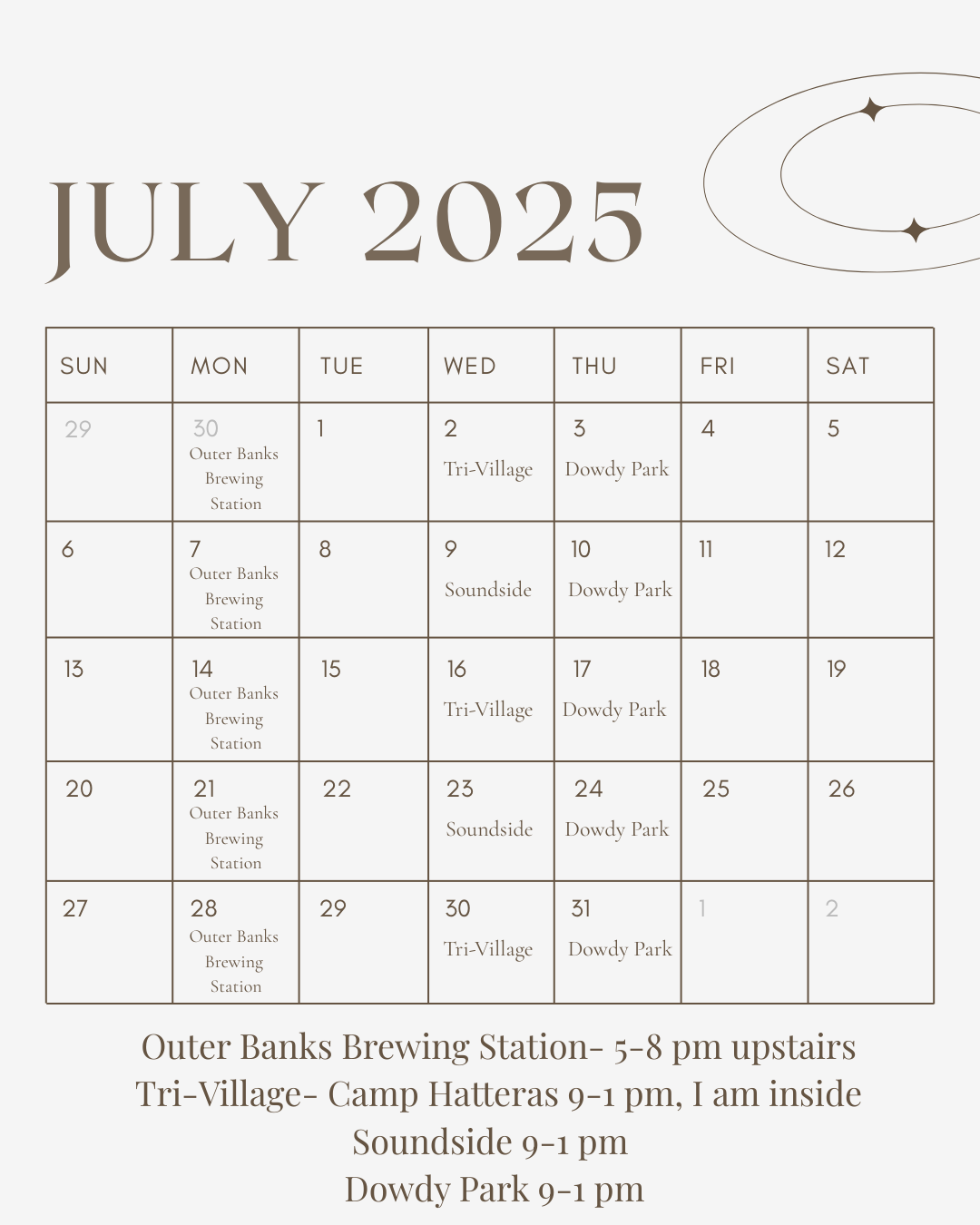 Wednesdays I alternate between Tri-Village Market at Camp Hatteras and Soundside. There is a Corolla Cork and Craft show August 6th. Check the calender for the week by week schedule.