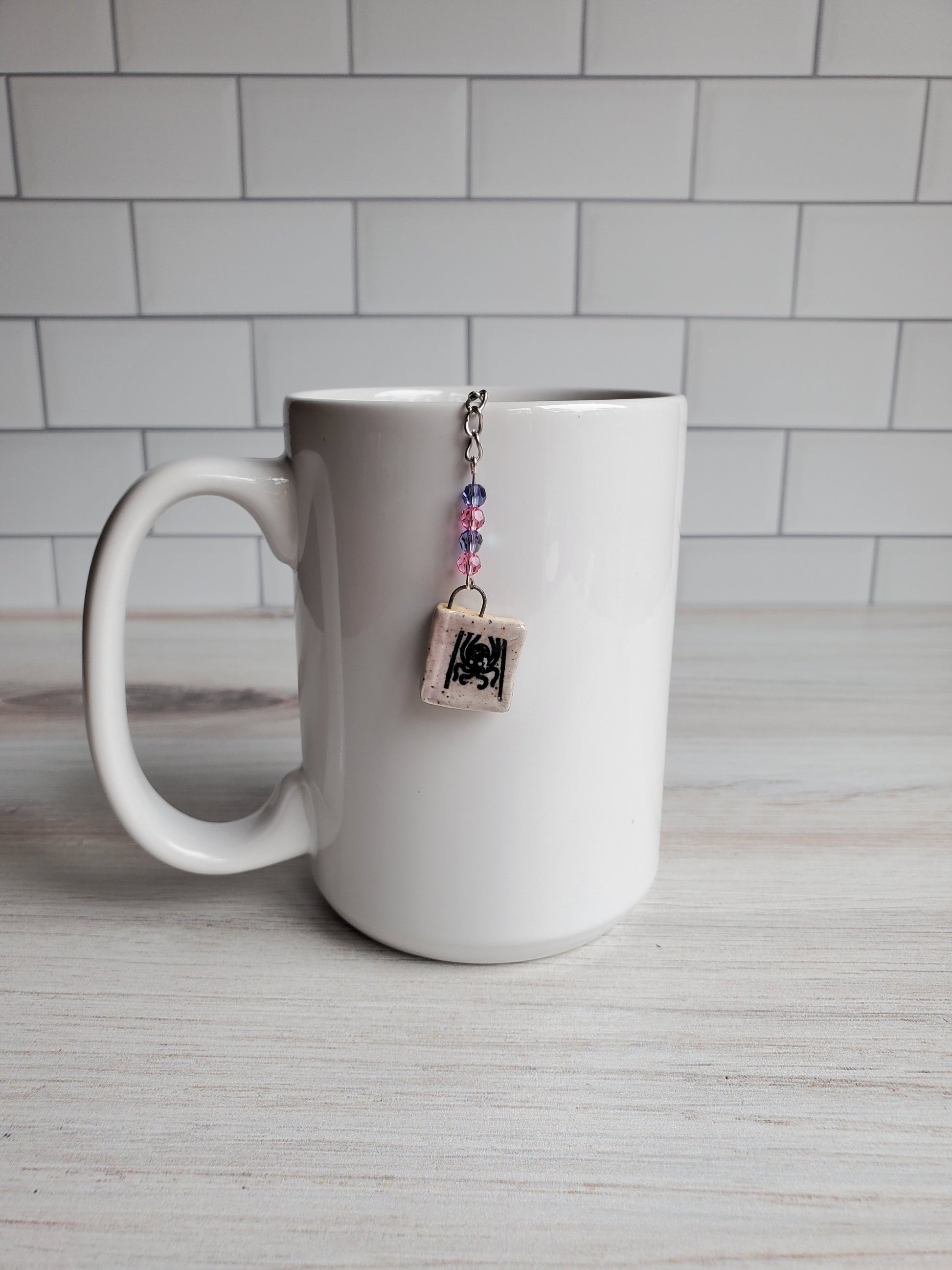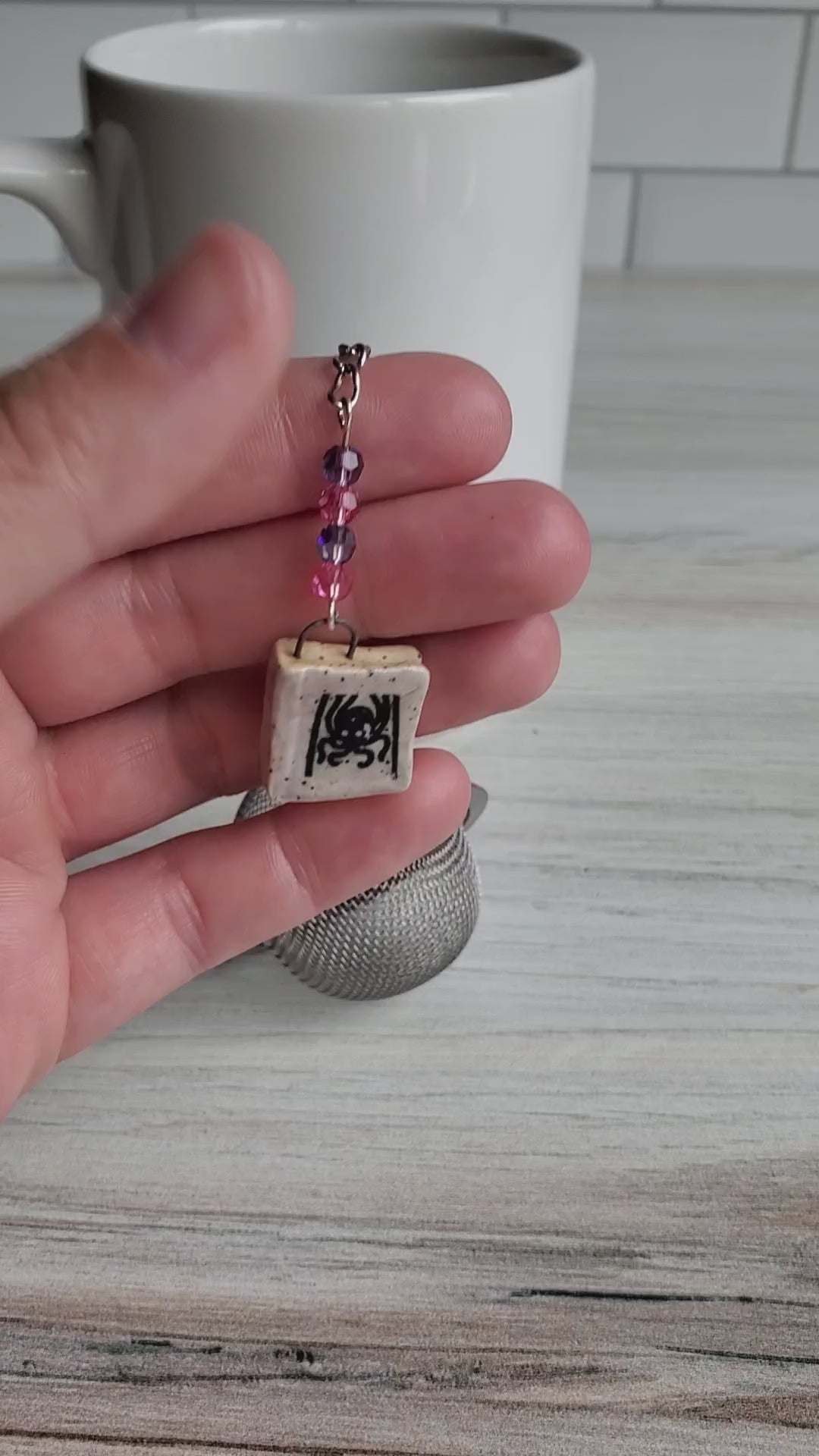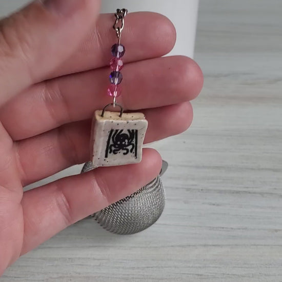 Book-Shaped Pottery Tea Infuser Charm, purple with spider accent - a grounding gift for book and tea lovers alike. Elevate your tea ritual with one of our adorable tea infusers. Handmade pottery charms made from midfire speckled stoneware with an accent of colorful crystals, this infuser is sure to impress. So sit back, grab a book, relax, and enjoy your favorite loose-leaf tea.