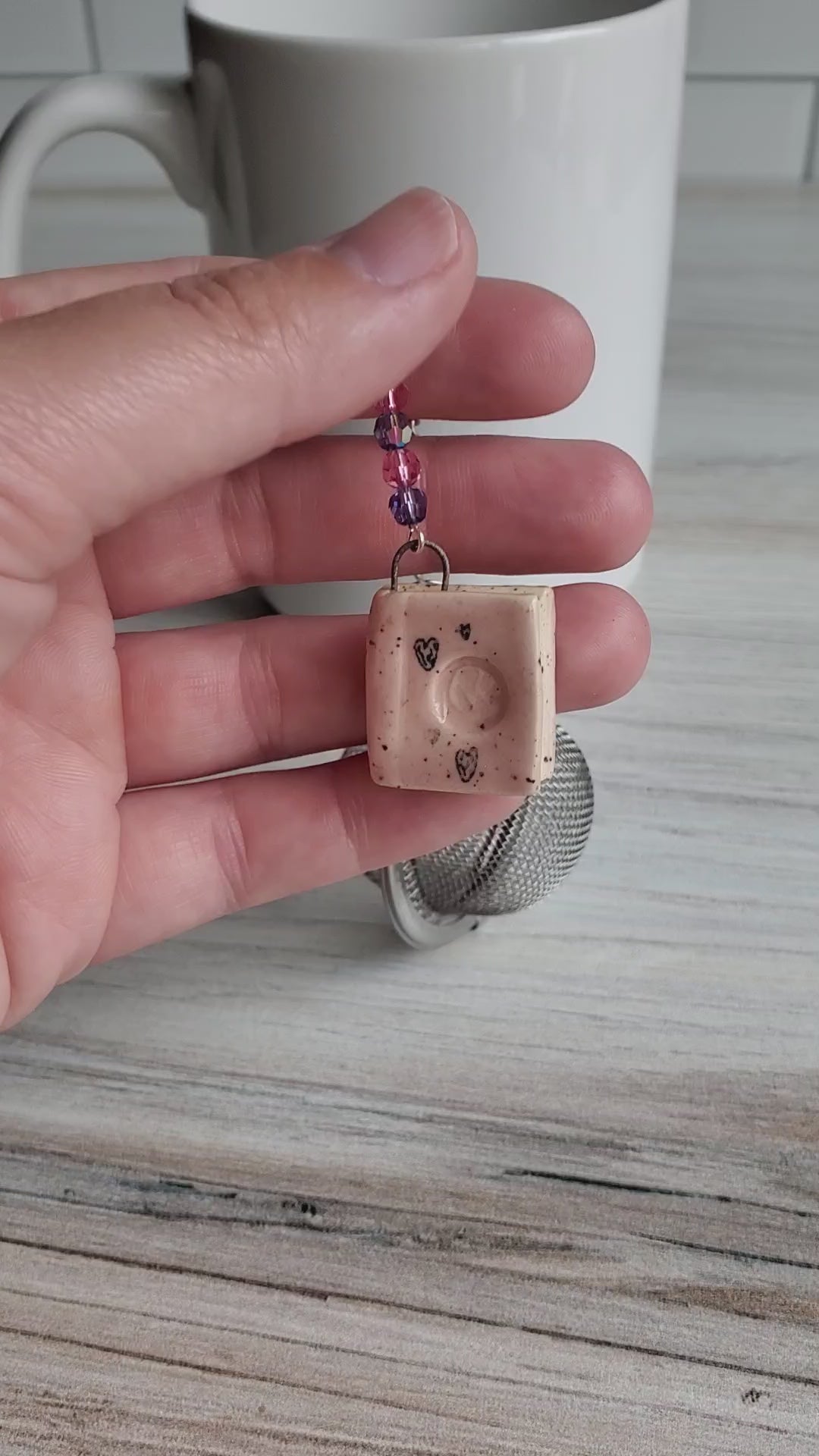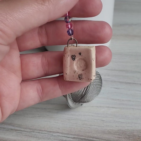 Book-Shaped Pottery Tea Infuser Charm with hearts - a grounding gift for book and tea lovers alike. Elevate your tea ritual with one of our adorable tea infusers. Handmade pottery charms made from midfire speckled stoneware with an accent of colorful crystals, this infuser is sure to impress. So sit back, grab a book, relax, and enjoy your favorite loose-leaf tea.