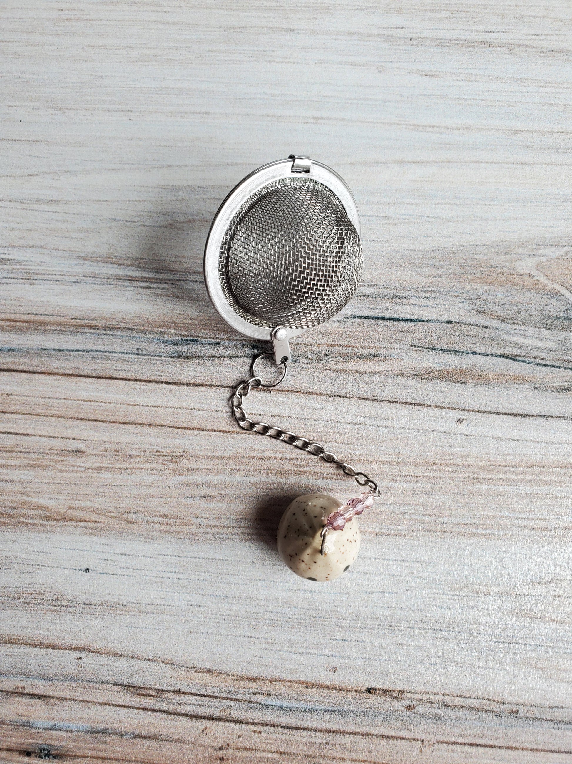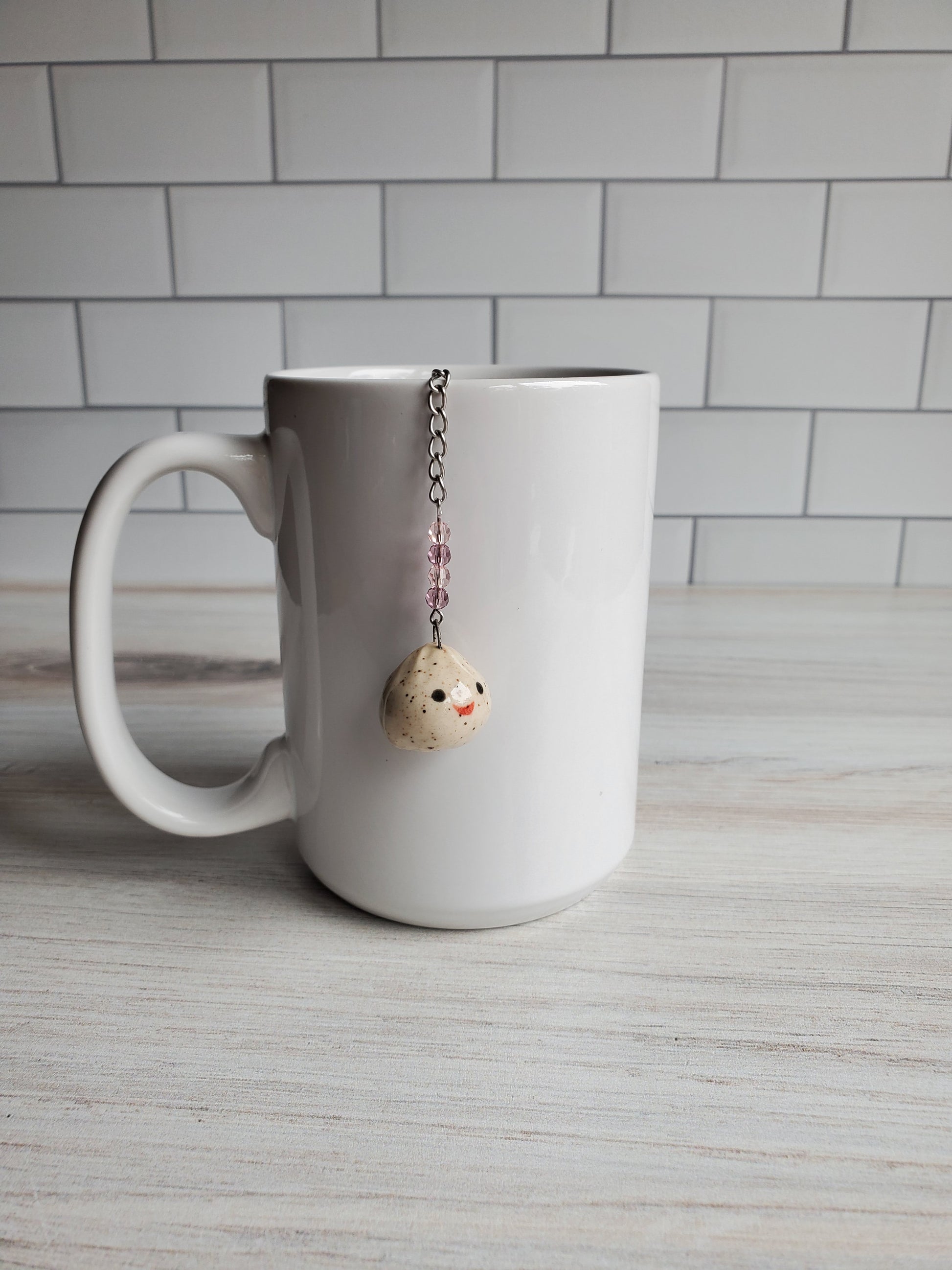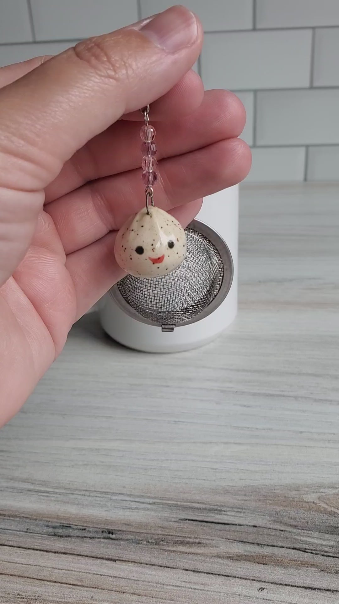 Dumpling-Shaped Pottery Tea Infuser Charm- a beautiful gift for a tea lover. Elevate your tea ritual with one of our adorable tea infusers. Handmade pottery charms made from midfire speckled stoneware with an accent of colorful crystals, this infuser is sure to impress. So sit back, grab a book, relax, and enjoy your favorite loose-leaf tea.