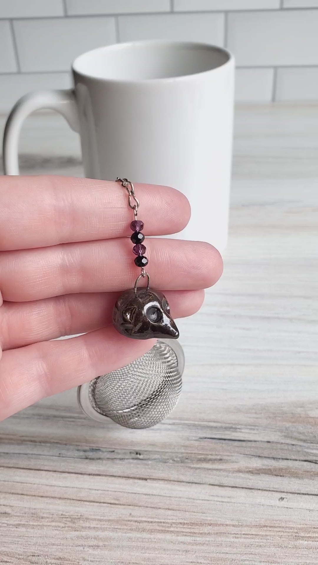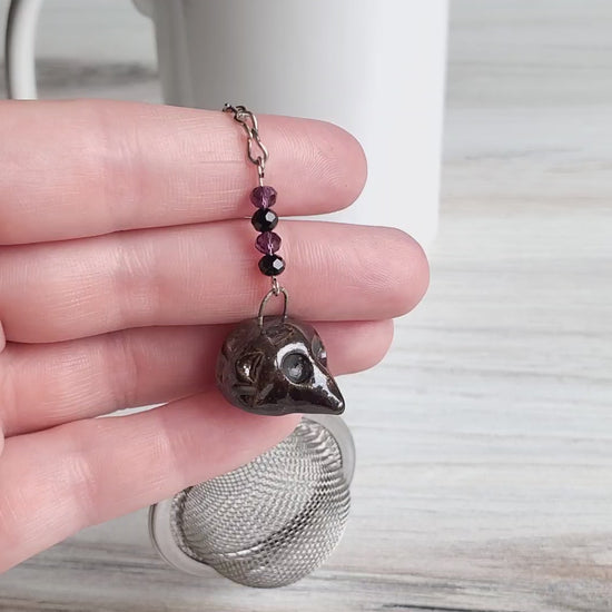 Hedgehog-Shaped Pottery Tea Infuser Charm with a book accent - a beautiful gift for a tea lover. Elevate your tea ritual with one of our adorable tea infusers. Handmade pottery charms made from midfire speckled stoneware with an accent of colorful crystals, this infuser is sure to impress. So sit back, grab a book, relax, and enjoy your favorite loose-leaf tea.
