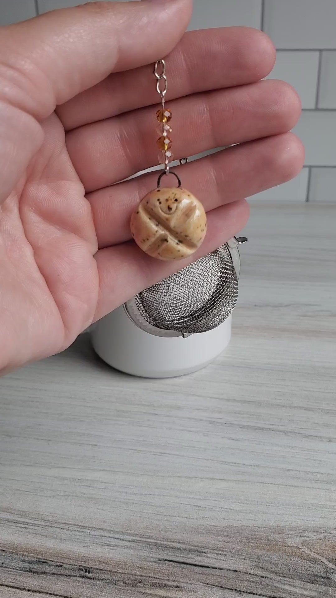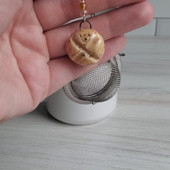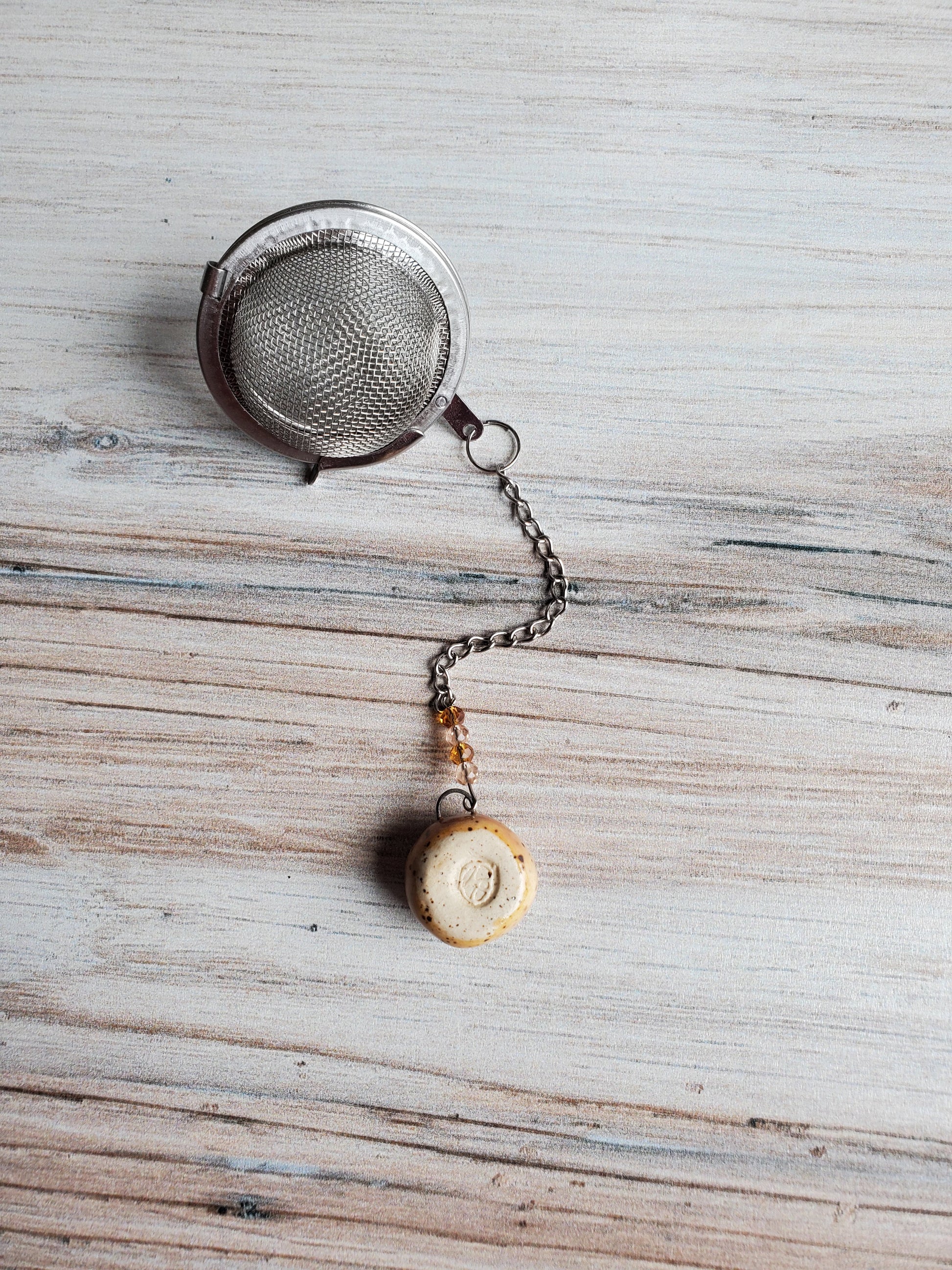 Sourdough-Shaped Pottery Tea Infuser Charm with crystal beaded accent - a beautiful gift for a tea lover. Elevate your tea ritual with one of our adorable tea infusers. Handmade pottery charms made from midfire speckled stoneware with an accent of colorful crystals, this infuser is sure to impress. So sit back, grab a book, relax, and enjoy your favorite loose-leaf tea.